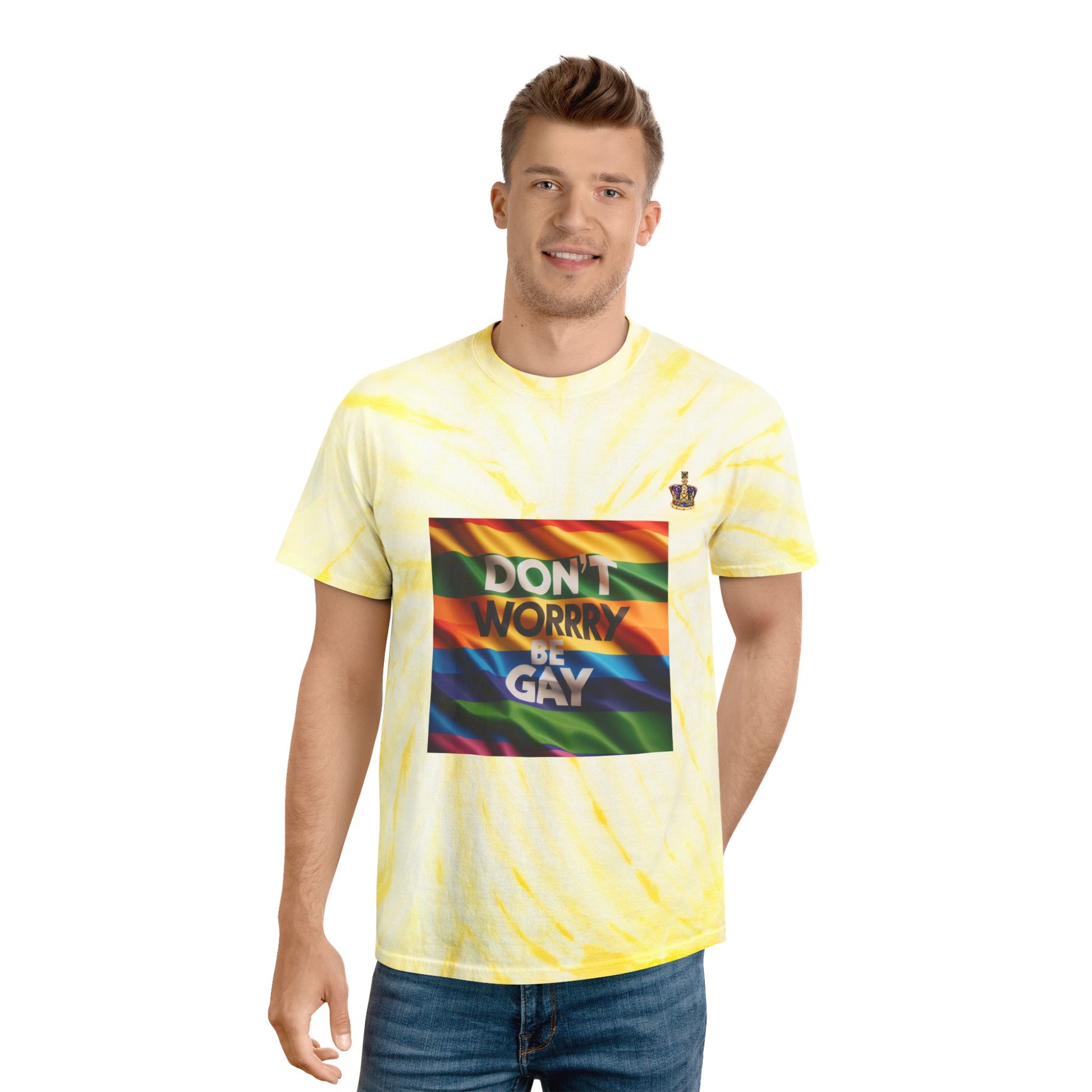 Vibrant Tie-Dye Tee | Don't Worry Be Gay | Perfect for Pride, Festivals, Casual Wear, Gifts, LGBTQ+ Events